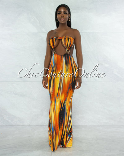 *Nesley Orange Black Print Cut-Out Gold Accent Maxi Dress
