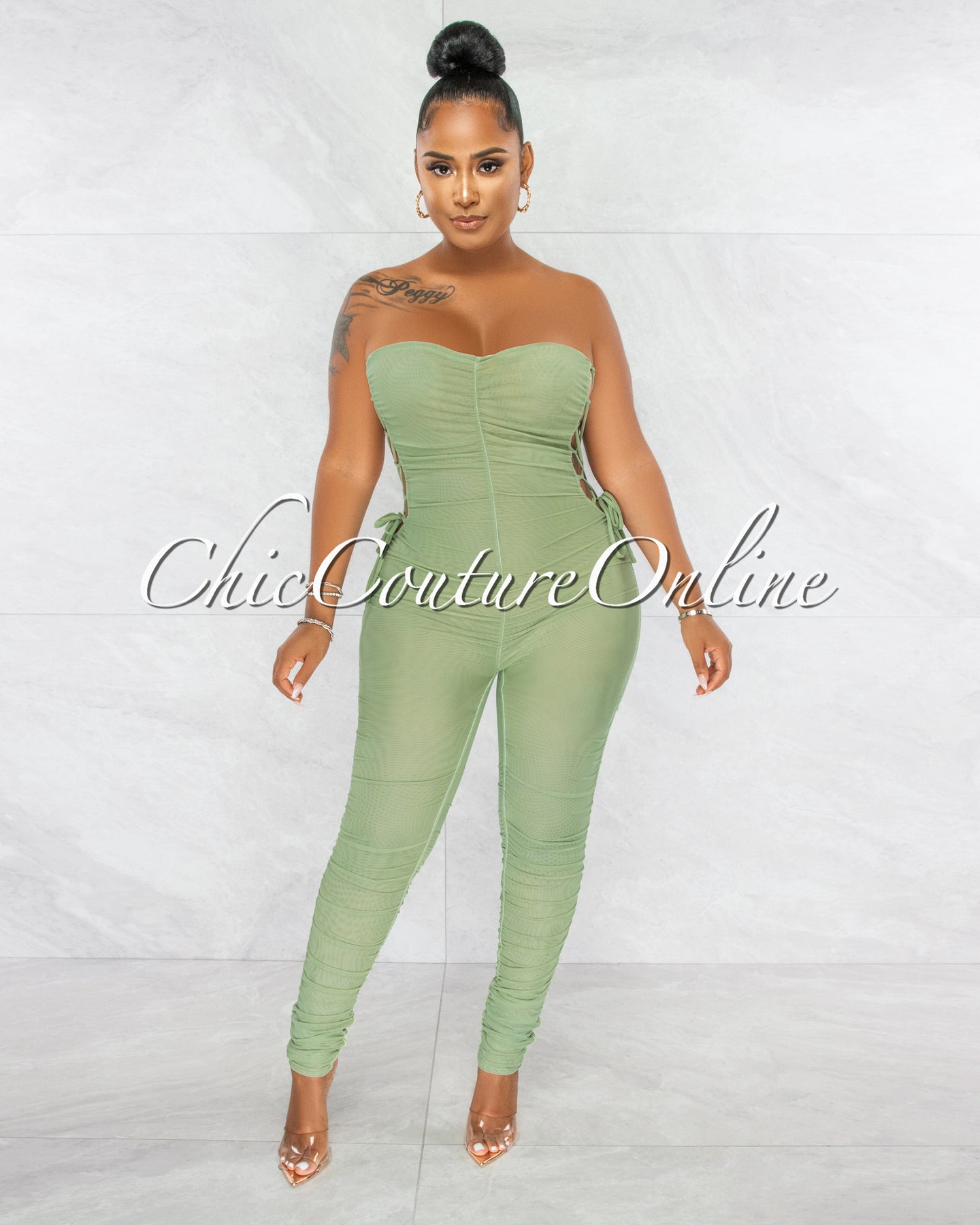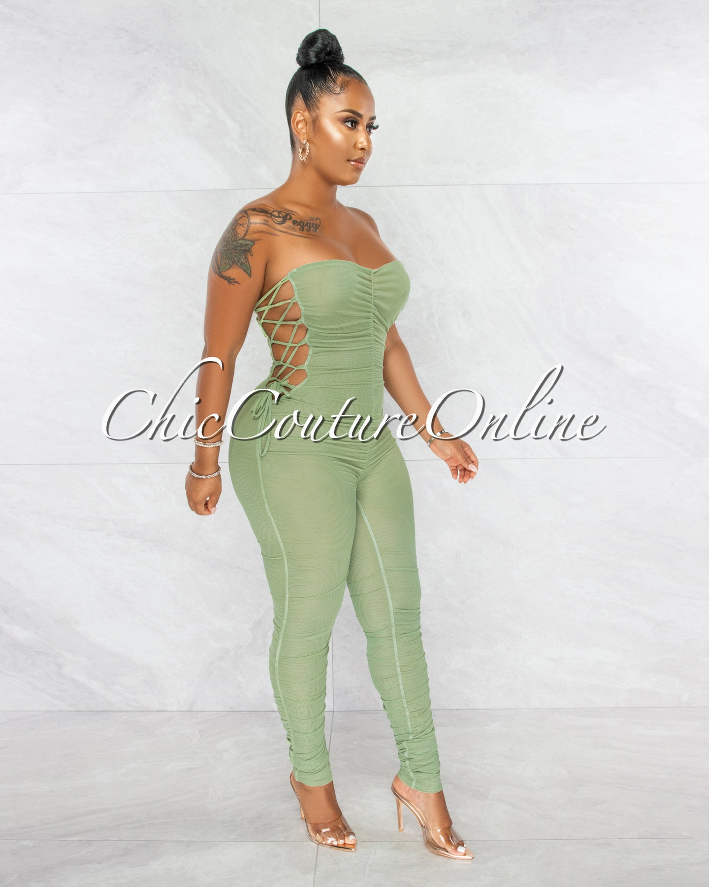 *Mikela Sage Mesh Sheer Ruched Lace-Up Sides Jumpsuit