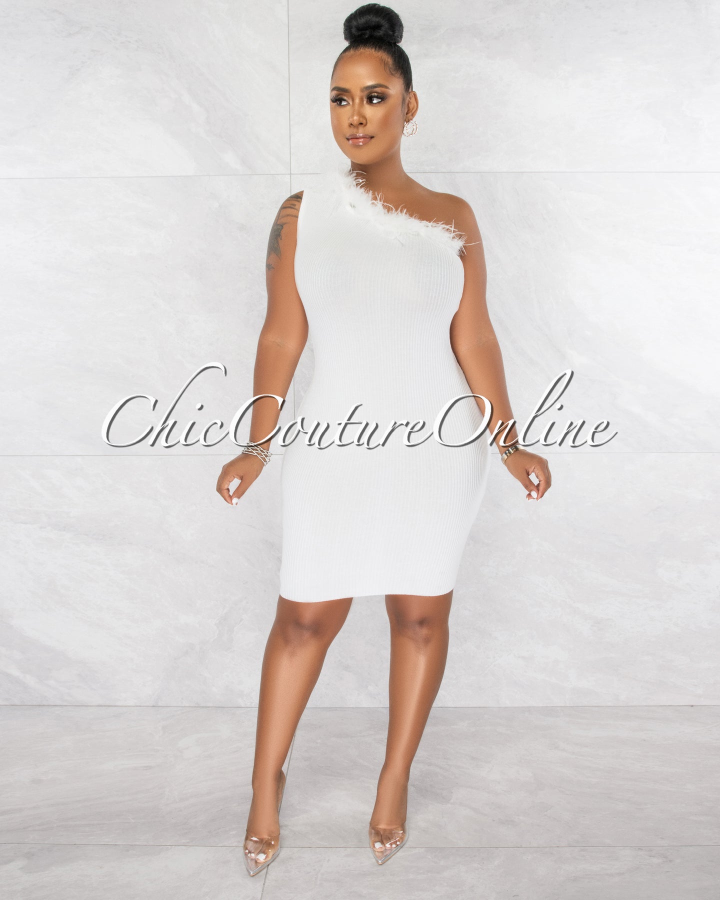 *Rawnie Off-White Feather Neckline Single Shoulder Ribbed Dress