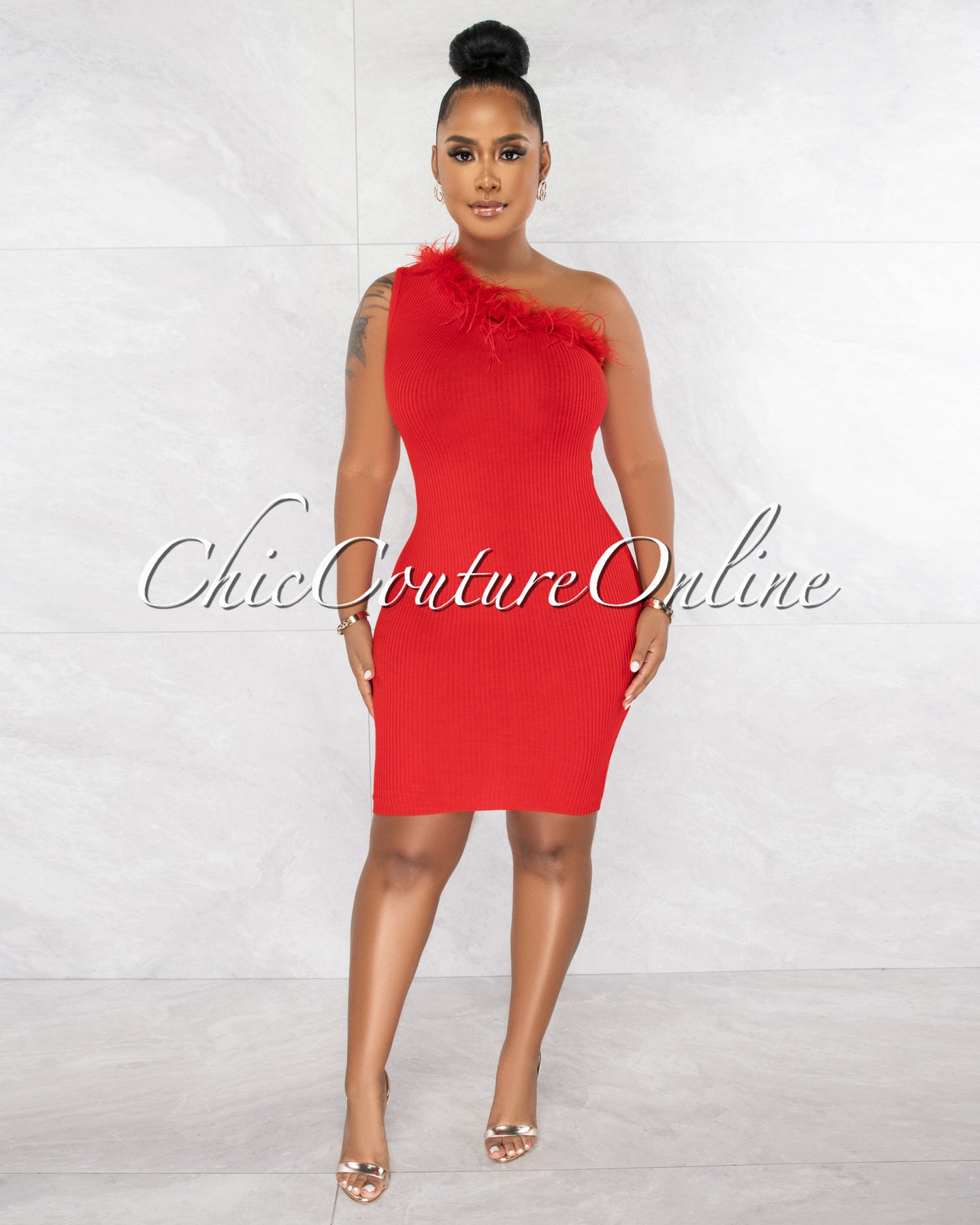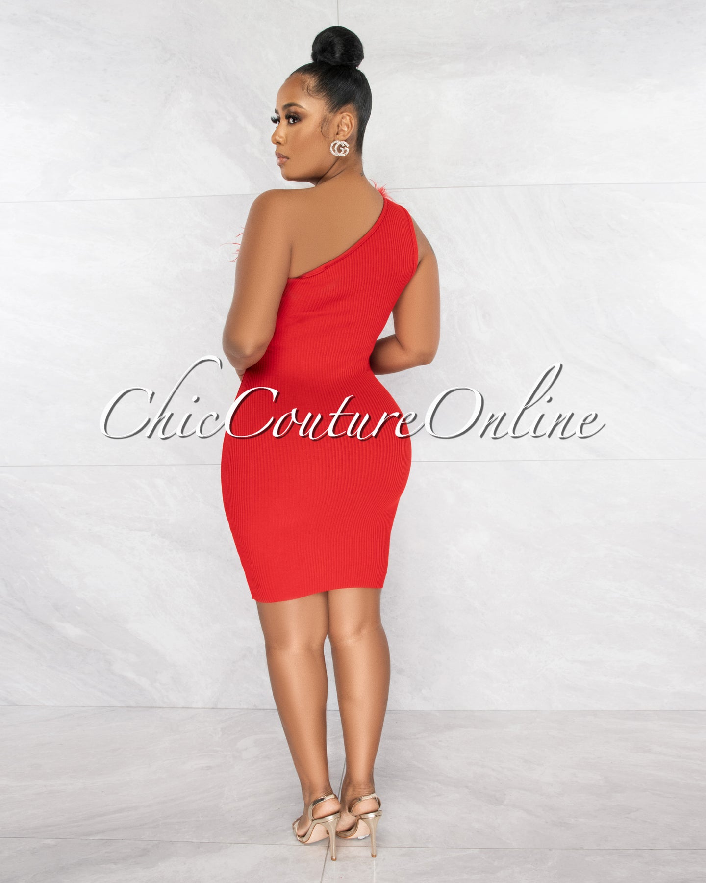 *Rawnie Red Feather Neckline Single Shoulder Ribbed Dress