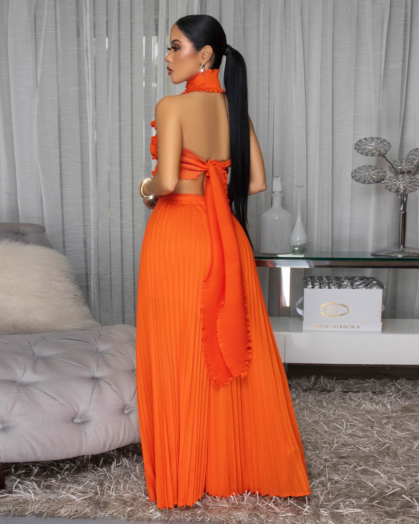 Miabelle Orange Pleated LUXE Crop Top & Pants Set