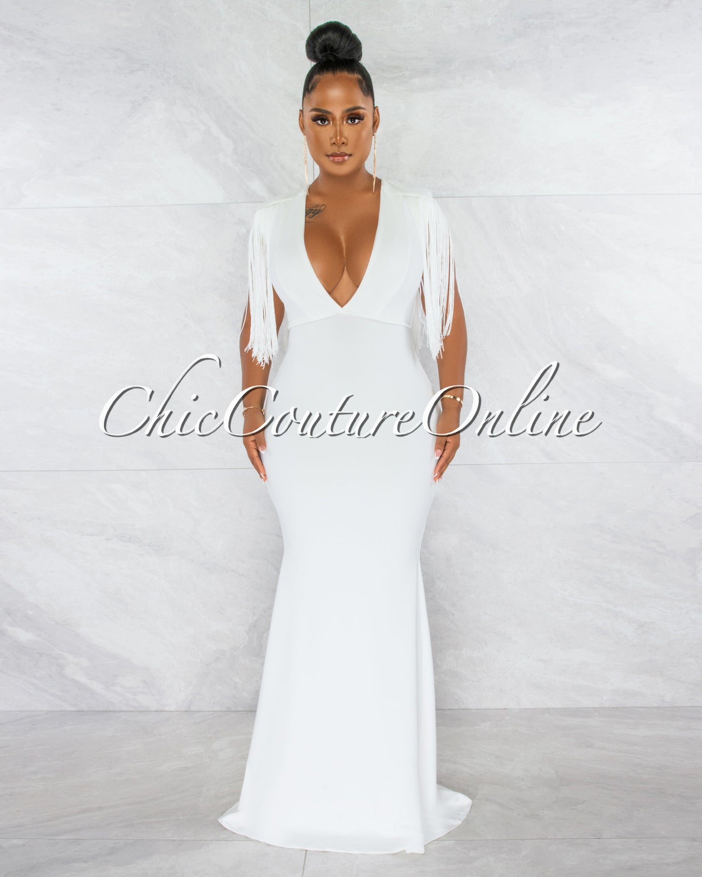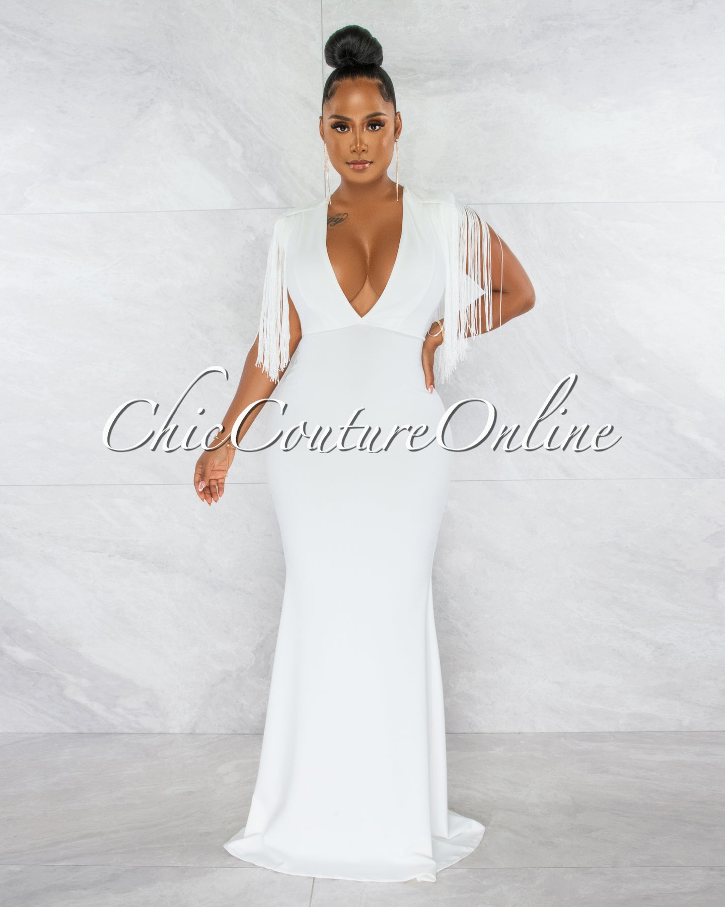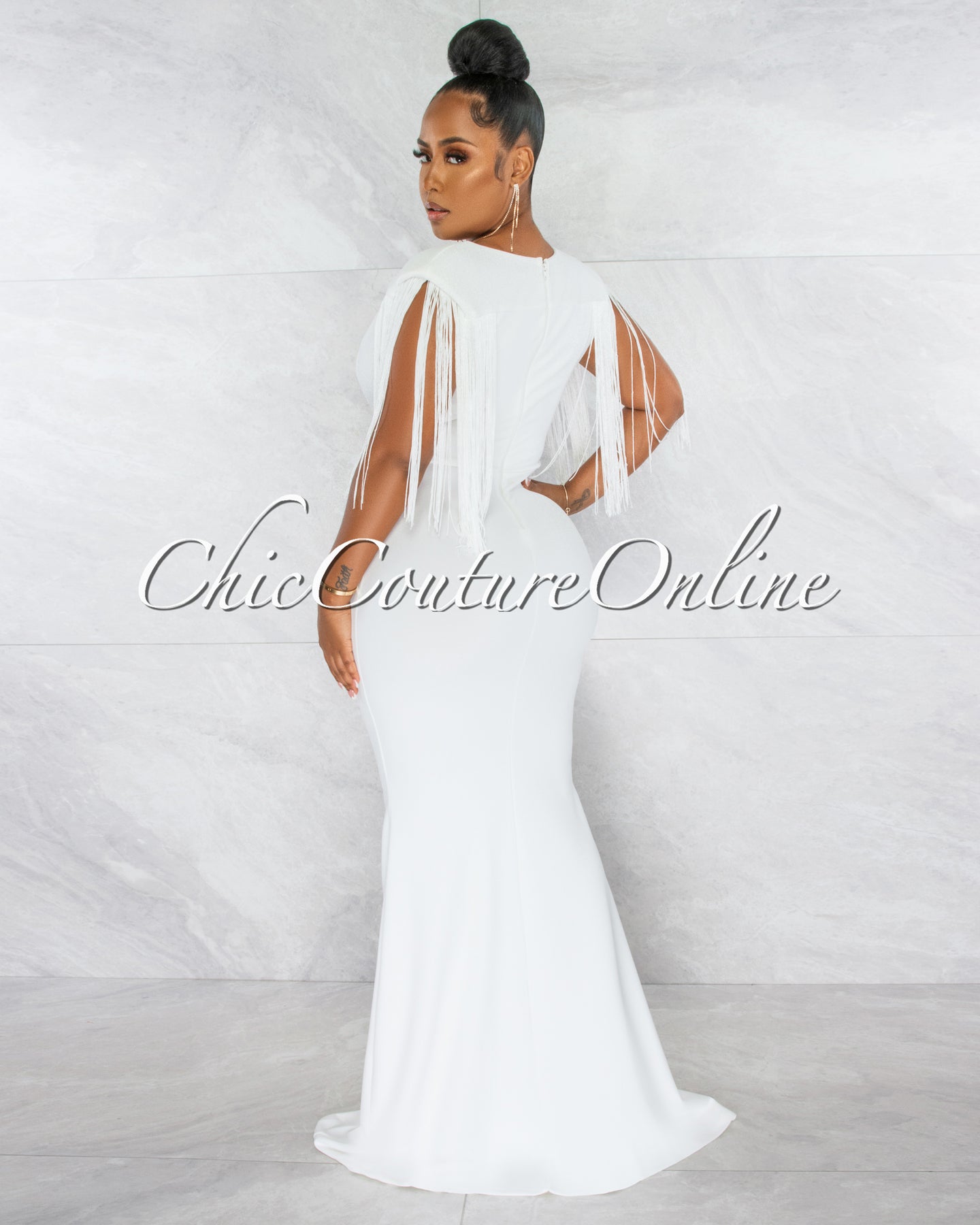 *Orane Off-White Fringe Shoulders Semi-Mermaid Maxi Dress