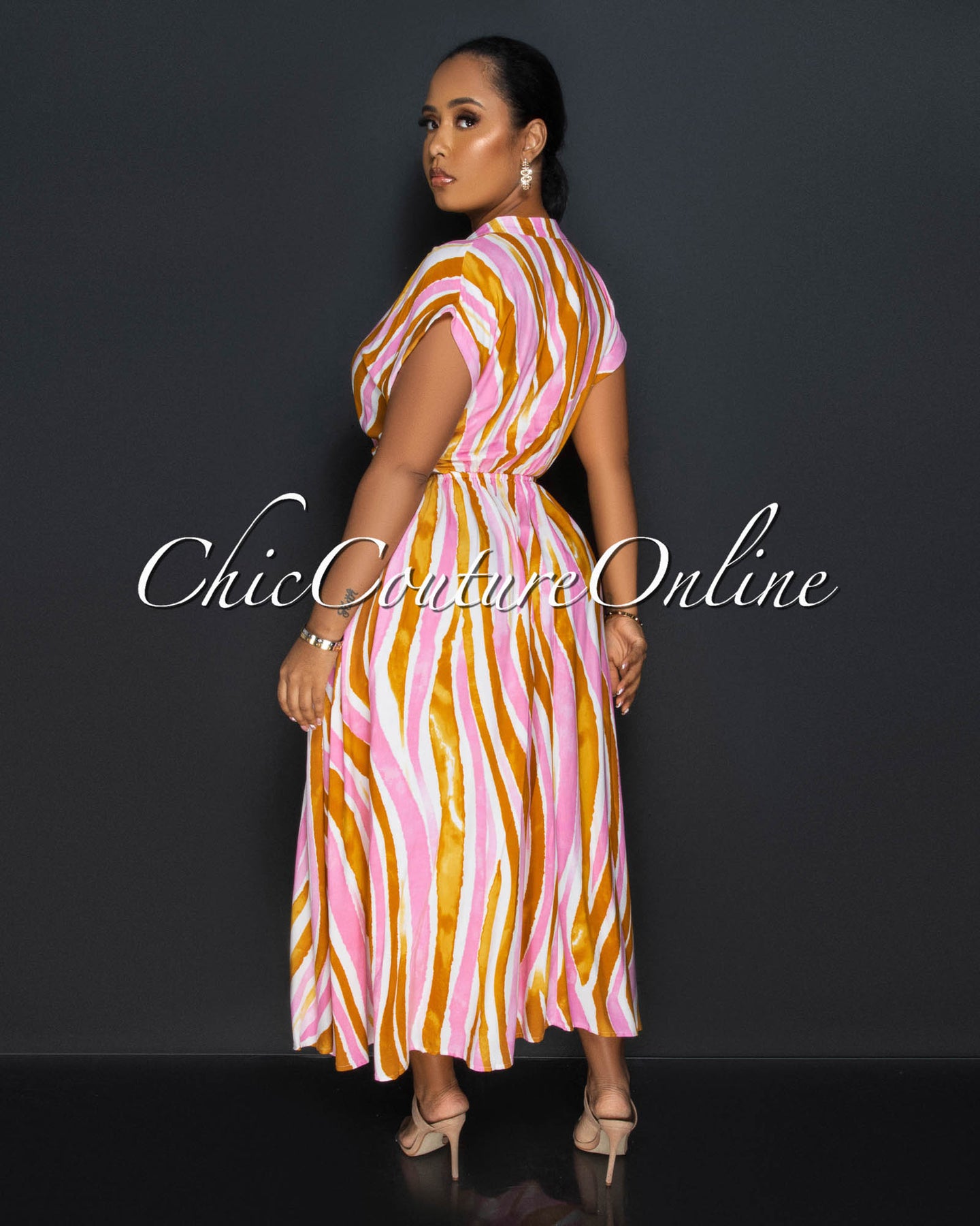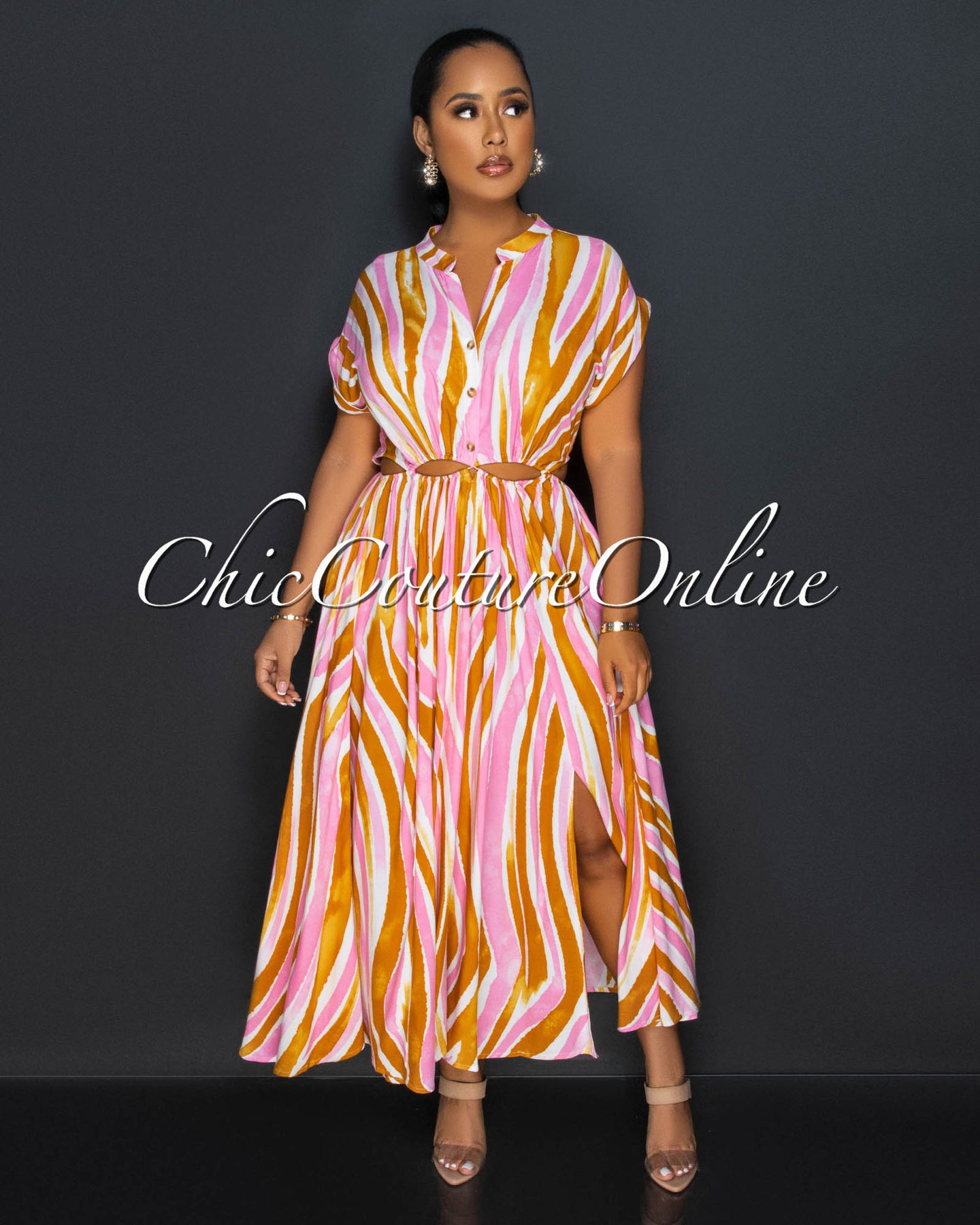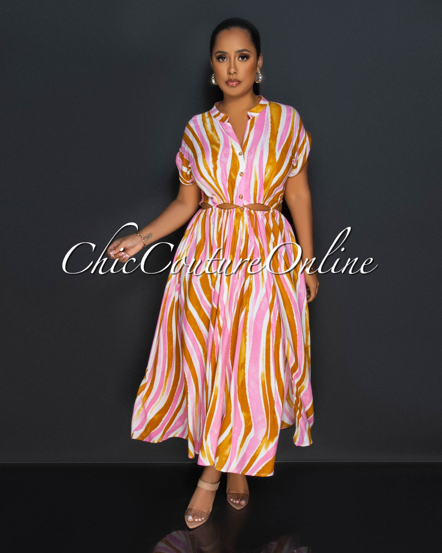 *Rhaul Pink Brown Print Waist Cut-Out Maxi Dress