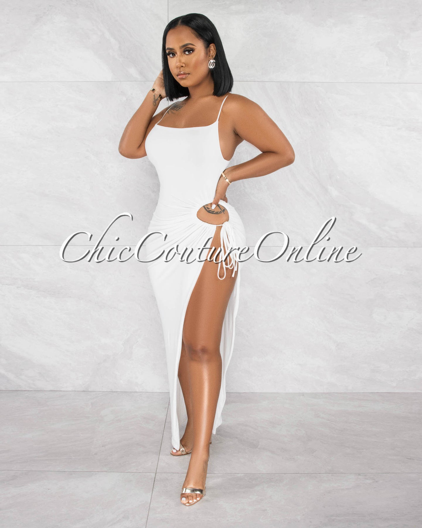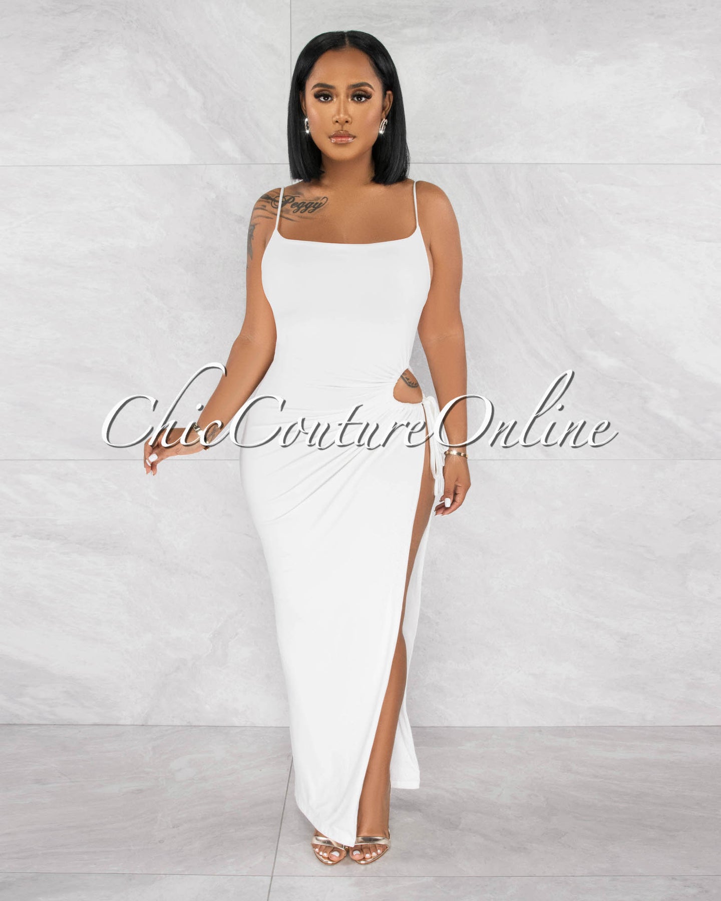 *Siyana Off-White Cut-Out Side Slit Double Lined Maxi Dress