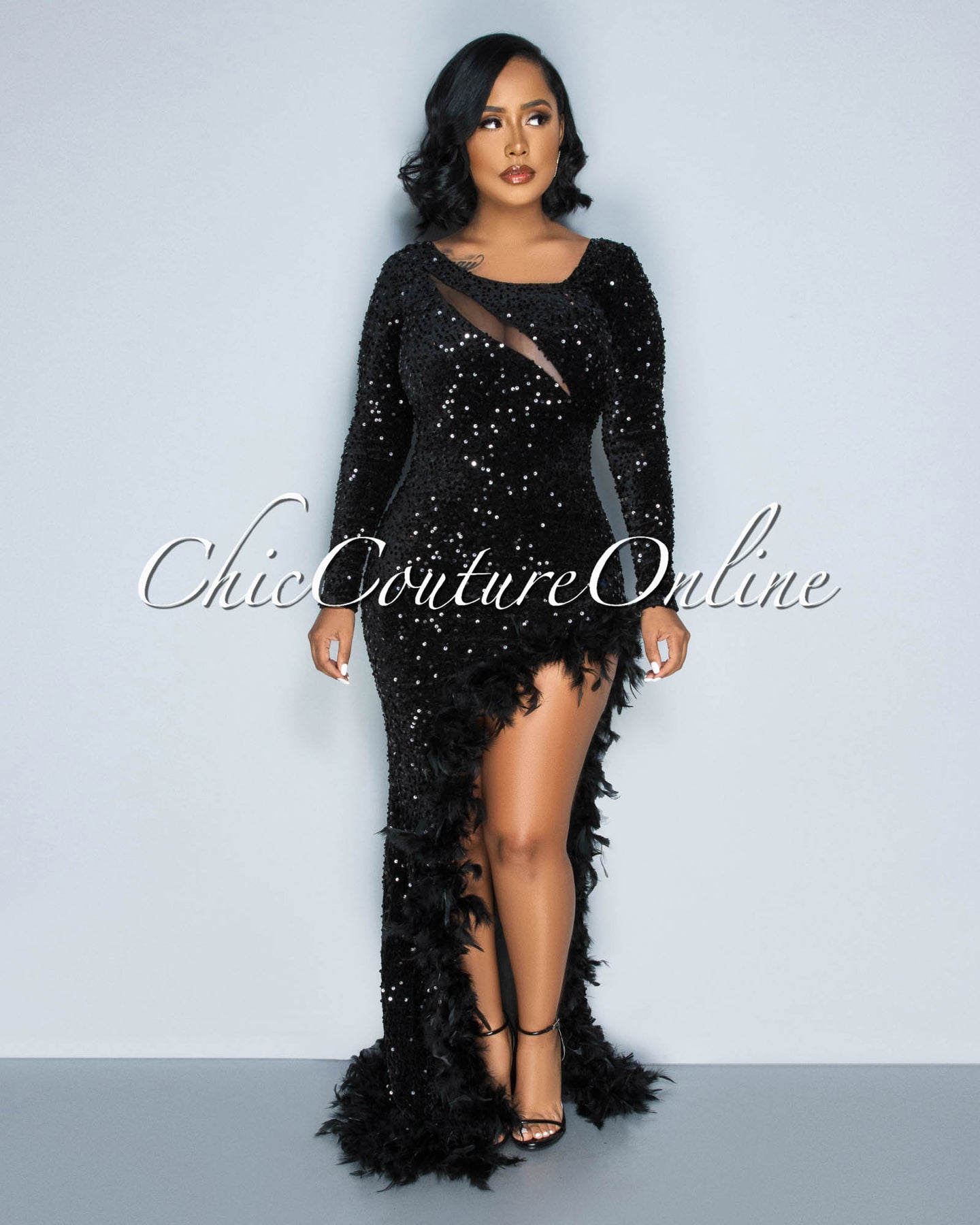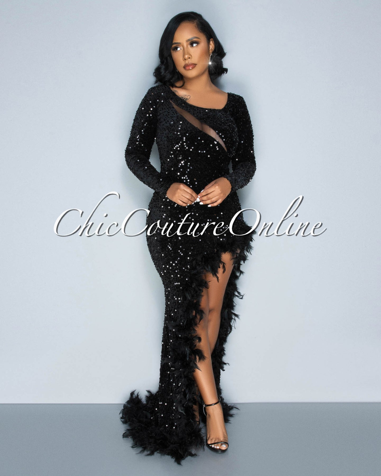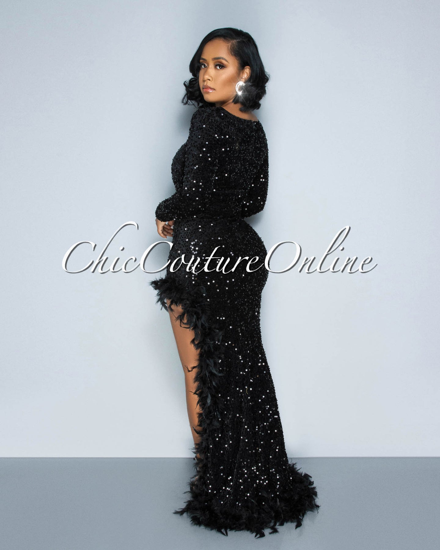 Janie Black Sequins Feather Hem Leg Slit Maxi Dress