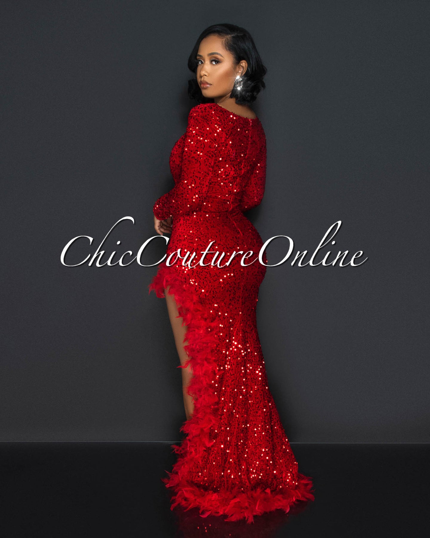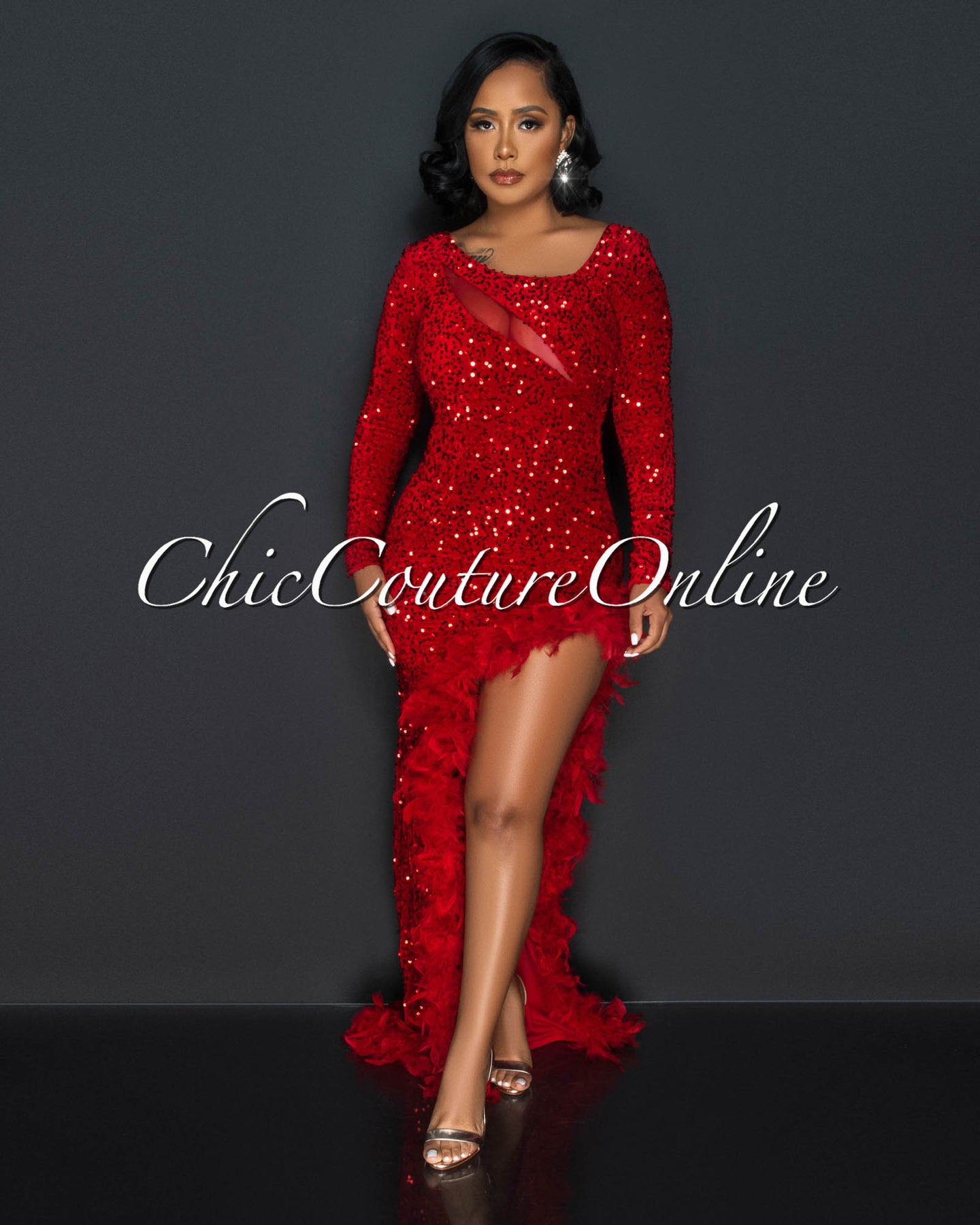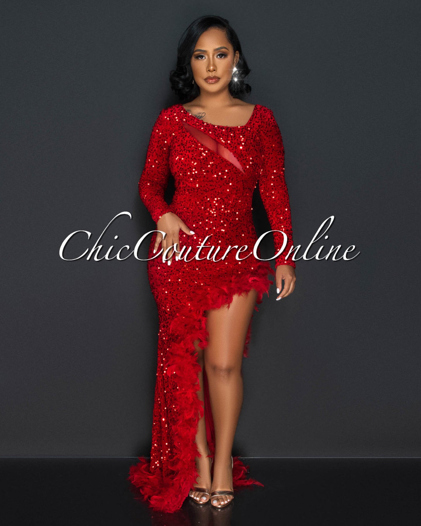 Janie Red Sequins Feather Hem Leg Slit Maxi Dress