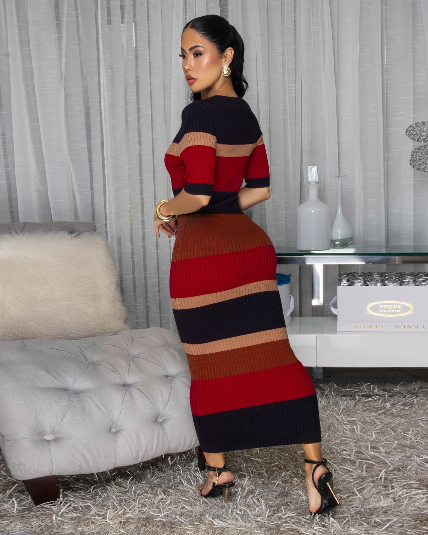 Favianna Burgundy Balck Multi-Color Stripes Midi Dress
