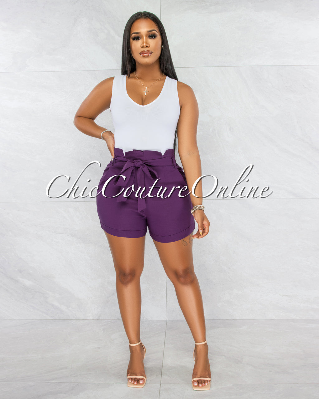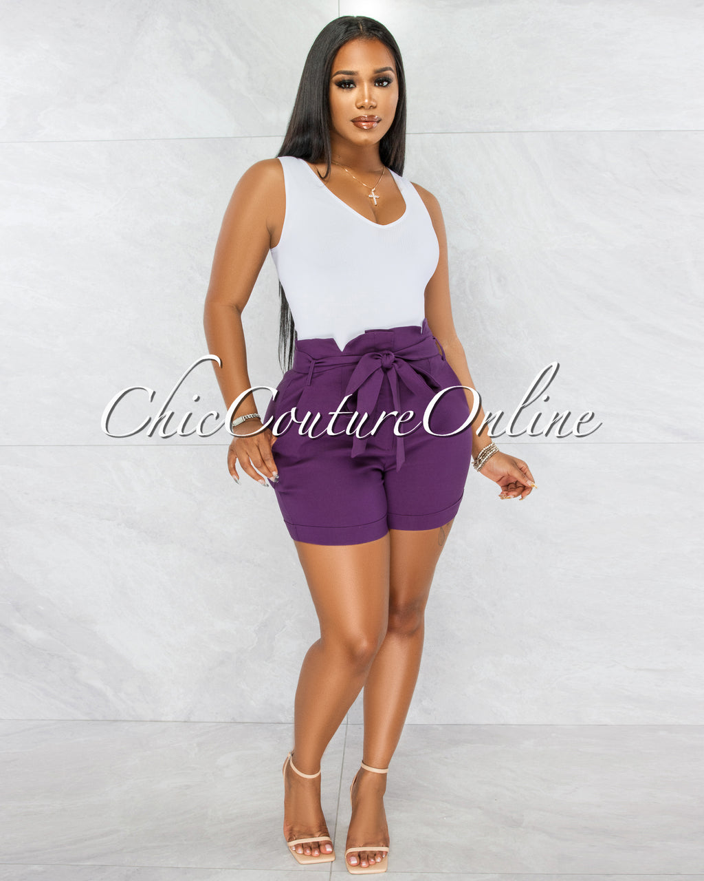 Parthenia Eggplant Paper Bag Waist Self-Tie Belt Shorts